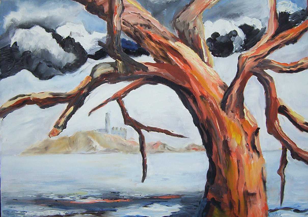 Geborstenes Eis der Havel, Acryl a. Lwd., B x H = 60 x 120 cm. Mit gespiegeltem Geäst der Uferbäume. Nicht signiert. Nachlaßstempel rückseitig. Entstanden Kurs Rolf Fässer Klosterheide 2006. Katalog WK Nr. 531