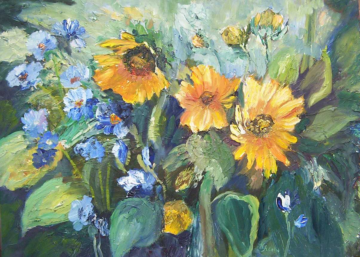 Blumenpracht, Acryl auf Papier. BxH = 77 x 105 cm. Signatur rückseitig Konstanze Klein. Entstanden als Reaktion auf das viele Schwarz des Asphaltlacks im Kurs "Asphaltlack und Terpentin", Dozent Michael Morgner, Internationale Sommerakademie 1996, Freie Kunsthochschule Berlin. Katalog WK Nr. 530