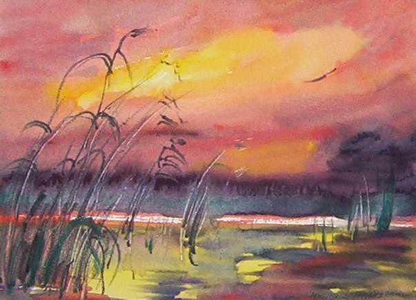Abendrot Aquarell. Sign. Konstanze Klein rechts unten. B x H = 40 x 30 cm. AufPapier gepinnt. Kann abgelöst werden. Ganz oben links auf dem Papierrand von der Hand der Malerin: Nr. 83. Katalog WK Nr. 90.