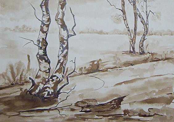 Flußlandschaft bei Fischerhude Aquarell. B x H = 40 x 30 cm. Signatur Konstanze Klein rechts unten. Auf der Rückseite findet sich folgende Notiz von der Hand der Malerin: Flußlandschaft 30. 10. 95 Nr. 79 Konstanze Klein Katalog WK Nr. 59