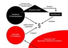 Nach erstmaligem Hören des Weihnachtsoratoriums von Johann Sebastian Bach beschrieb Hans-Rudolf Lutz, Lostorf, Schweiz seinen Eindruck so: “Dieses und viele andere ähnliche spätere Ereignisse machten mir zunehmend bewußt, in welch einzigartiger Weise der riesengroße Schatz der abendländischen Musik das Christliche wiedergibt. Keine andere Religion hat einen nur annähernd gleichen Fundus aufzuweisen” (12) . Es kann kein Zweifel sein, daß gerade die Deutschen mit Bach, Händel, Schütz, Telemann und anderen den Löwenanteil hierzu beigetragen haben, wie auch sonst in der Musik (Beethoven, Mozart, Haydn, Brahms, Schubert, Schumann, Mendelssohn, Weber, Wagner, v. Flotow, Mahler, Bruckner, Lotzing). Der deutsche Volks- und Kunstliedschatz gilt ( m.E. zu Recht ) noch heute als einmalig in der Welt. Auch im Bereich der bildenden Künste finden sich bedeutende Deutsche in nicht kleiner Zahl, die deutlich vor dem 1. Weltkrieg gelebt haben und deshalb auch dem Präsidenten Wilson hätten bekannt sein können. Beispielhaft seien aufgeführt Caspar David Friedrich, Dürer, Grünewald, Cranach, Holbein, Menzel, Schinkel. Am 19. Juli 1870 erklärte das Kaiserreich Frankreich nach Streitigkeiten um die spanische Thronfolge dem Königreich Preußen den Krieg. Die Herrscher der süddeutschen Staaten stellten sich gemäß ihrer Bündnisverträge, die jedoch nur im Verteidigungsfall zum Tragen kamen, an die Seite Preußens. Wie dieser Krieg ausging, darf als bekannt vorausgesetzt werden. Sein politisches Ergebnis war der Beitritt der süddeutschen Länder zum Norddeutschen Bund, die sog. Reichsgründung. König Wilhelm von Preußen wurde Deutscher Kaiser. Als Bismarcksche Reichsverfassung wird die Verfassung des Deutschen Reiches vom 16. April 1871 bezeichnet, die aus der 1866 ausgearbeiteten Verfassung des Norddeutschen Bundes hervorging. Das Deutsche Reich ist ein Bundesstaat, der nach der Idee der Reichsverfassung durch die Fürsten einiger deutscher Staaten und durch den Norddeutschen Bund gestiftet wurde. Die Staatsform bzw. das Regierungssystem, das durch die Verfassung von 1871 begründet wurde, wird in der Literatur als “eingeschränkte Monarchie” umschrieben. Denn auf der einen Seite blieb dem monarchischen Prinzip eine starke Stellung vorbehalten, auf der anderen Seite war dem Volk auf der Grundlage eines recht fortschrittlichen Wahlrechts durch den Reichstag eine Beteiligung an der Gesetzgebung gesichert. Einen Überblick zur Bismarckschen Reichsverfassung ermöglichen die beiden nachfolgenden Grafiken (13).